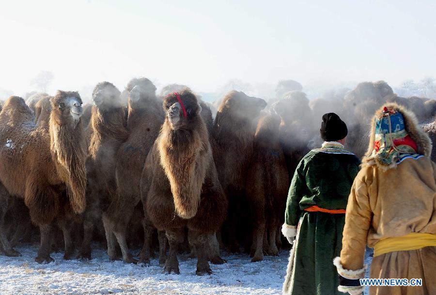Herdsmen and camels are seen at an opening ceremony of a camel culture festival in Xi Ujimqin Qi, north China's Inner Mongolia Autonomous Region, Jan. 5, 2014. A camel culture festival was held here on Sunday. (Xinhua/Ren Junchuan)