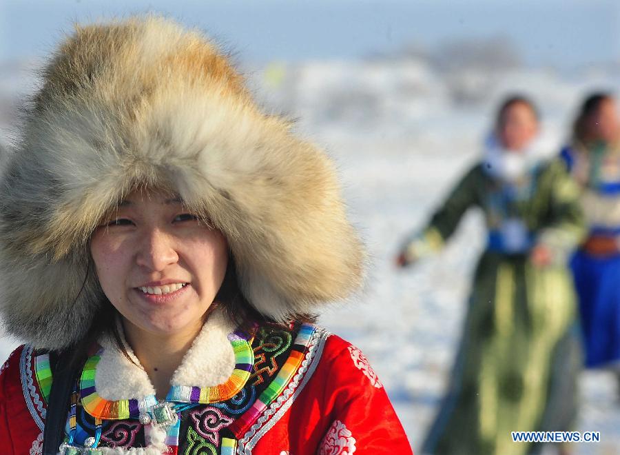 Photo taken on Jan. 5, 2014 shows a woman in traditional holiday attire of the Mongolian ethnic group at an ice and snow carnival in West Ujimqin Banner, north China's Inner Mongolia Autonomous Region. The winter carnival lasts from Jan. 4 to Jan. 5 here. (Xinhua/Wang Song)