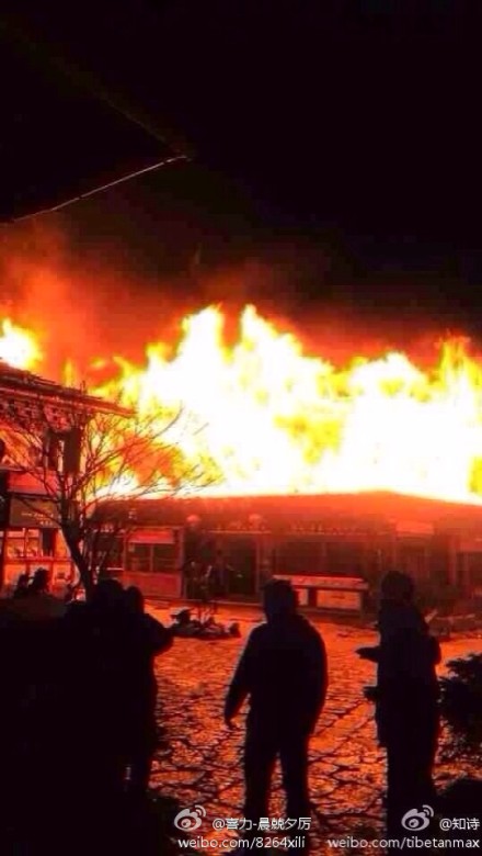 An ancient town in Shangri-la, a resort county in southwest China's Yunnan Province, caught fire early Saturday, local authorities said. [Photo: weibo.com]