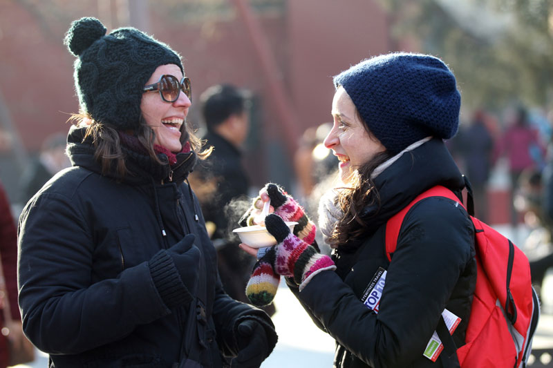 Two foreigners eat Laba Porridge at Yonghe Lama Temple during Laba Festival, a traditional Chinese holiday celebrated on the eighth day of the 12th month of the Lunar Chinese calendar, which falls on Jan 8 this year. The lamas of Yonghegong Lama Temple in Beijing serve Laba porridge to visitors every year for Laba Festival. It is believed the porridge can bring people good fortune and predicts a plentiful harvest for the next year. [Photo/Asianews]