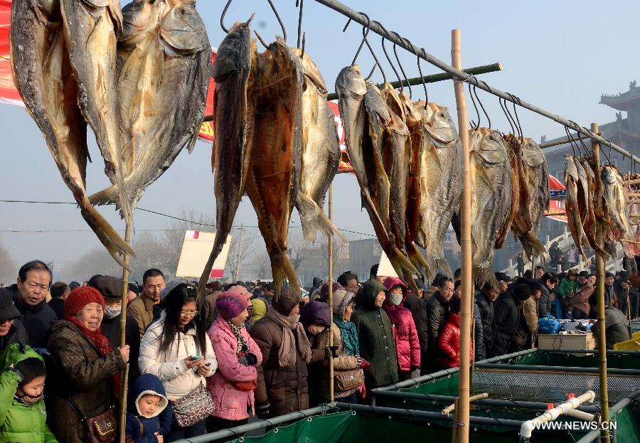 Citizens look on during a fishing festival at the Longting Lake, Kaifeng, central China's Henan Province, Jan. 18, 2014. The winter catch held on Saturday attracted many citizens and tourists who braved the cold and purchased fish they selected. (Xinhua/Wang Song)