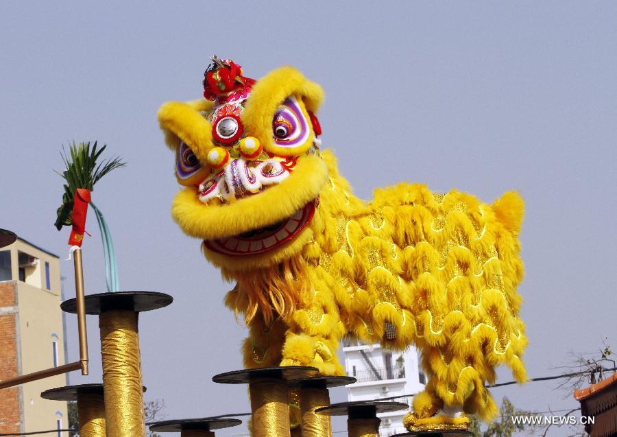 A lion dance performance is held to celebrate the upcoming Chinese Lunar New Year which falls on Jan. 31 in Phnom Penh, Cambodia, Jan. 24, 2014. [Xinhua/Sovannara]