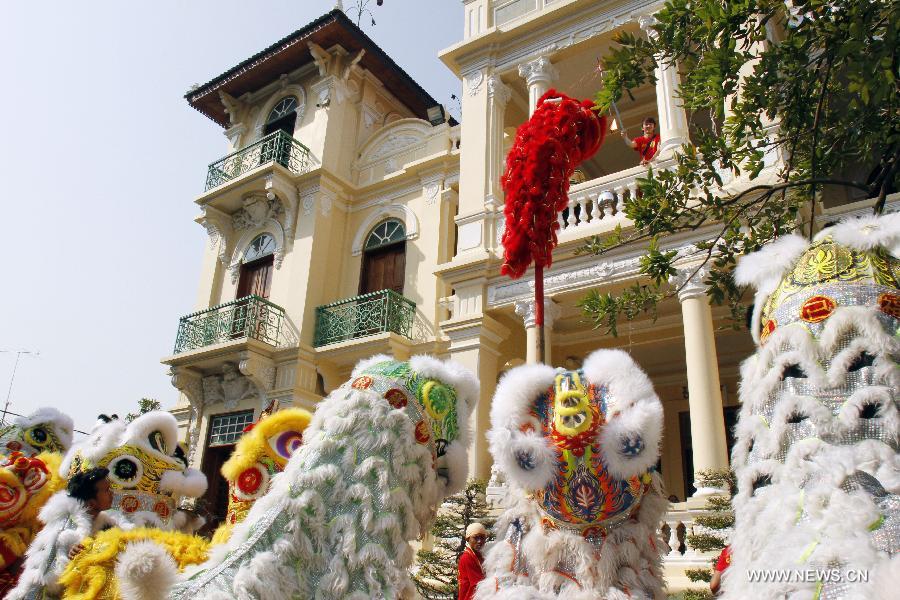 A lion dance performance is held to celebrate the upcoming Chinese Lunar New Year which falls on Jan. 31 in Phnom Penh, Cambodia, Jan. 24, 2014. [Xinhua/Sovannara]