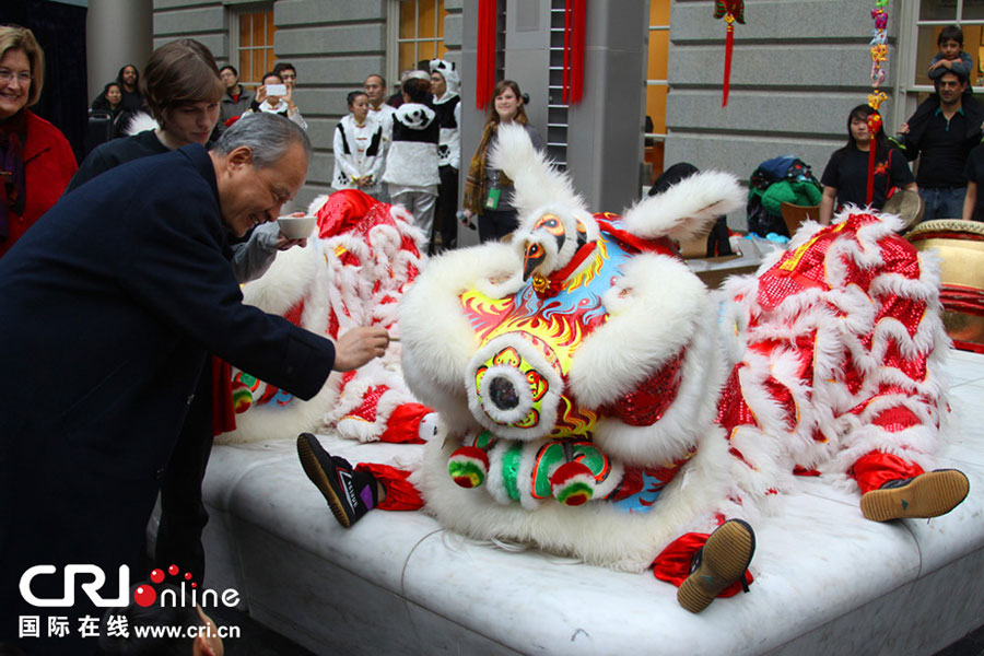 The Family Day was kicked off by China's Ambassador to the US Cui Tiankai, who gave the finishing touch to a lion costume.