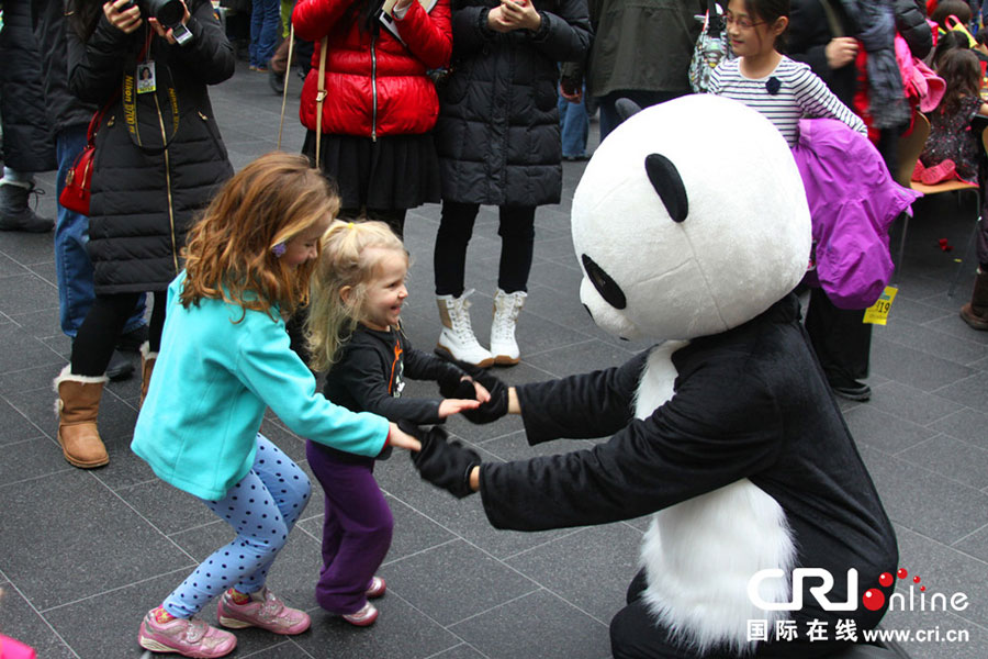 Two girls interact with a staff member wearing a panda costume at the Family Day Jan. 25, 2014. (Photo/CRI Online)