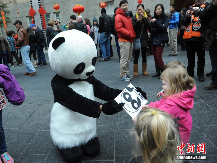 A little girl gives a panda picture to "Mr. Panda" at the Family Day Jan. 25, 2014. (Photo/Chinanews.com