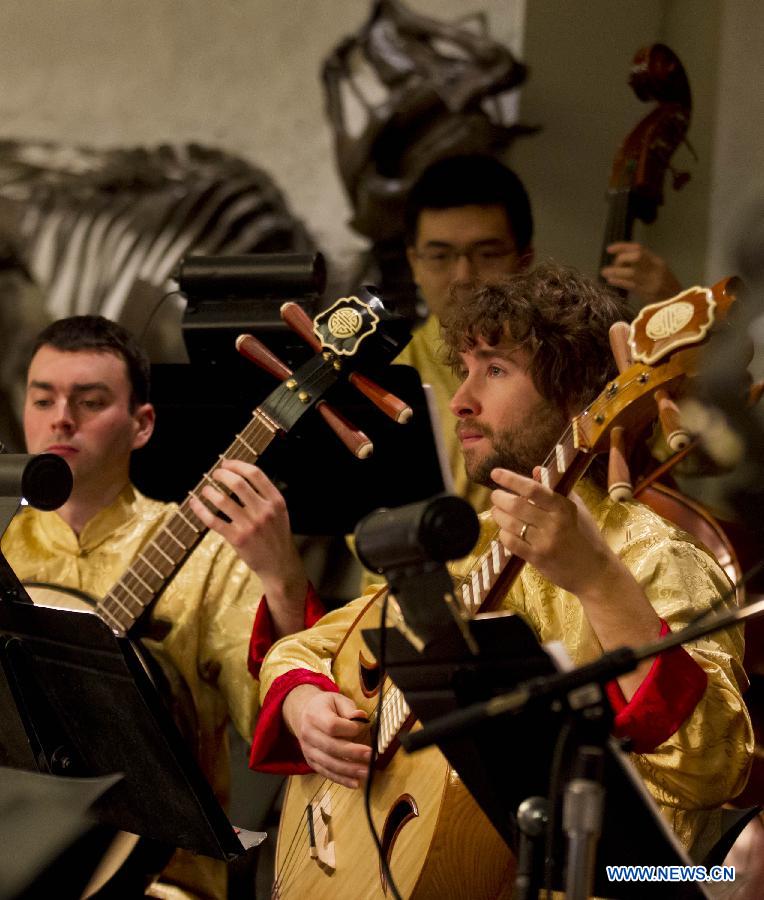 Members of the Toronto Chinese Orchestra perform during the 2014 Chinese New Year Extravaganza at the Royal Ontario Museum in Toronto, Canada, Jan. 25, 2014. The event provided an opportunity for Canadians to learn about Chinese culture while celebrating the coming Lunar New Year of the Horse, which begins on Jan. 31. [Xinhua/Zou Zheng]