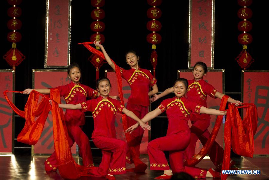 Girls perform Chinese dance during the 2014 Chinese New Year Extravaganza at the Royal Ontario Museum in Toronto, Canada, Jan. 25, 2014. The event provided an opportunity for Canadians to learn about Chinese culture while celebrating the coming Lunar New Year of the Horse, which begins on Jan. 31. [Xinhua/Zou Zheng]