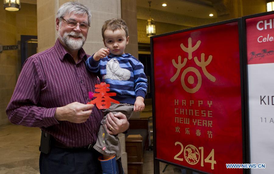 A boy shows a paper craft made by himself with his grandfather during the 2014 Chinese New Year Extravaganza at the Royal Ontario Museum in Toronto, Canada, Jan. 25, 2014. The event provided an opportunity for Canadians to learn about Chinese culture while celebrating the coming Lunar New Year of the Horse, which begins on Jan. 31. [Xinhua/Zou Zheng]