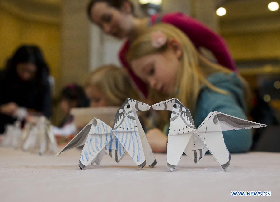 Kids learn to fold paper horse during the 2014 Chinese New Year Extravaganza at the Royal Ontario Museum in Toronto, Canada, Jan. 25, 2014. The event provided an opportunity for Canadians to learn about Chinese culture while celebrating the coming Lunar New Year of the Horse, which begins on Jan. 31. [Xinhua/Zou Zheng]