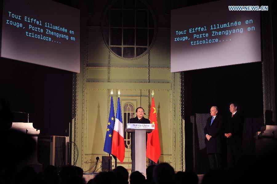 Chinese Cultural Minister Cai Wu speaks during the "Nuit de Chine"(Night of China) grand soiree held in Paris, France, Jan. 27, 2014. The "Nuit de Chine" grand soiree marking the 50th anniversary of diplomatic relations between France and China was held at the Grand Palais in Paris. (Xinhua/Chen Xiaowei)