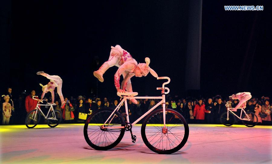 Chinese acrobats perform during the "Nuit de Chine"(Night of China) grand soiree held in Paris, France, Jan. 27, 2014. The "Nuit de Chine" grand soiree marking the 50th anniversary of diplomatic relations between France and China was held at the Grand Palais in Paris. (Xinhua/Chen Xiaowei)