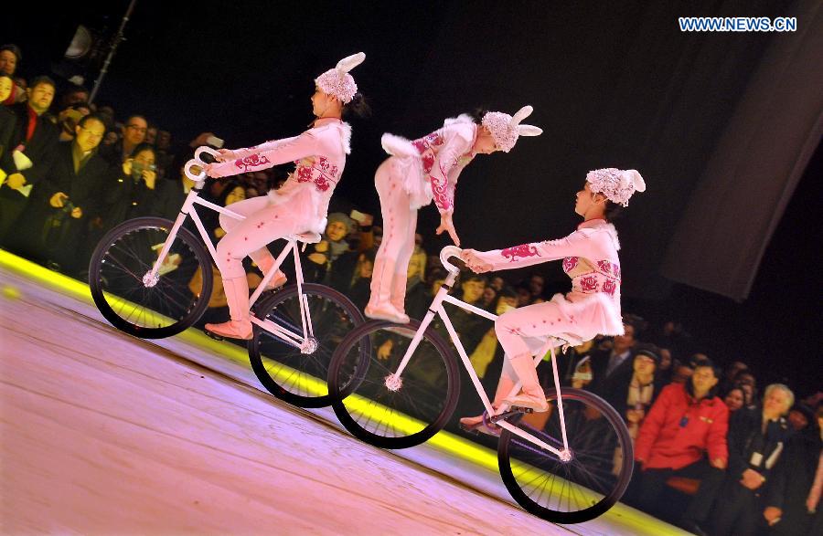 Chinese acrobats perform during the "Nuit de Chine"(Night of China) grand soiree held in Paris, France, Jan. 27, 2014. The "Nuit de Chine" grand soiree marking the 50th anniversary of diplomatic relations between France and China was held at the Grand Palais in Paris. (Xinhua/Chen Xiaowei)