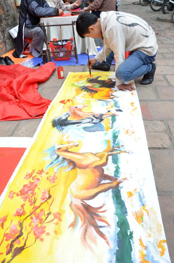 A man paints a horse to welcome the upcoming 2014 Lunar New Year, the Year of Horse, in Hanoi, capital of Vietnam, Jan. 28, 2014. Displaying spring couplets and calligraphy works during the Lunar New Year festival is one of long-standing traditions of Vietnamese people. (Xinhua/Yan Jianhua)