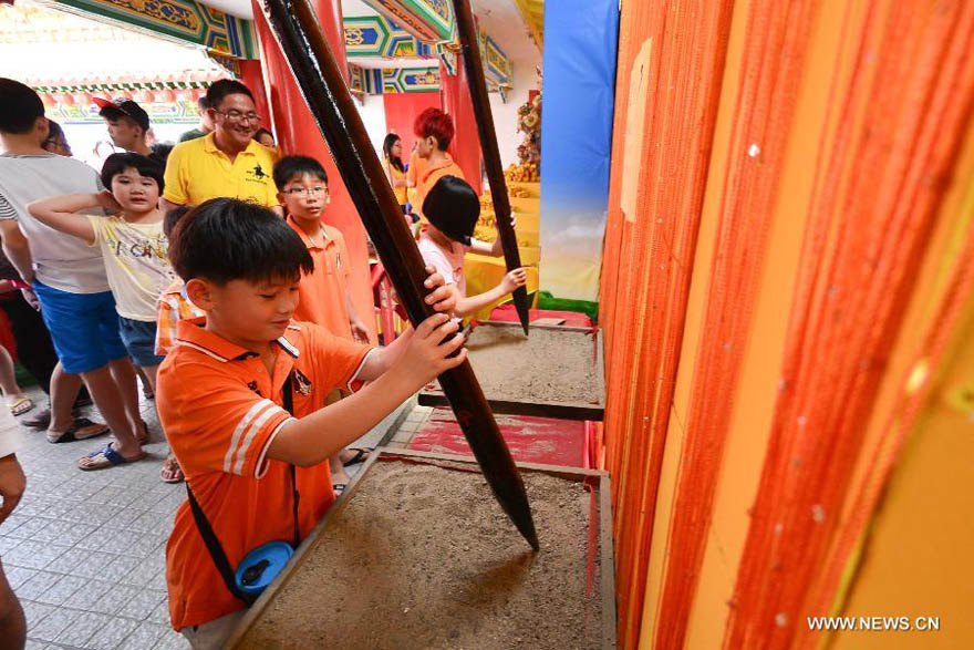 A kid writes at a temple to celebrate the Chinese Lunar New Year in Kuala Lumpur, Malaysia, Feb. 2, 2014. [Xinhua/Chong Voon Chung]