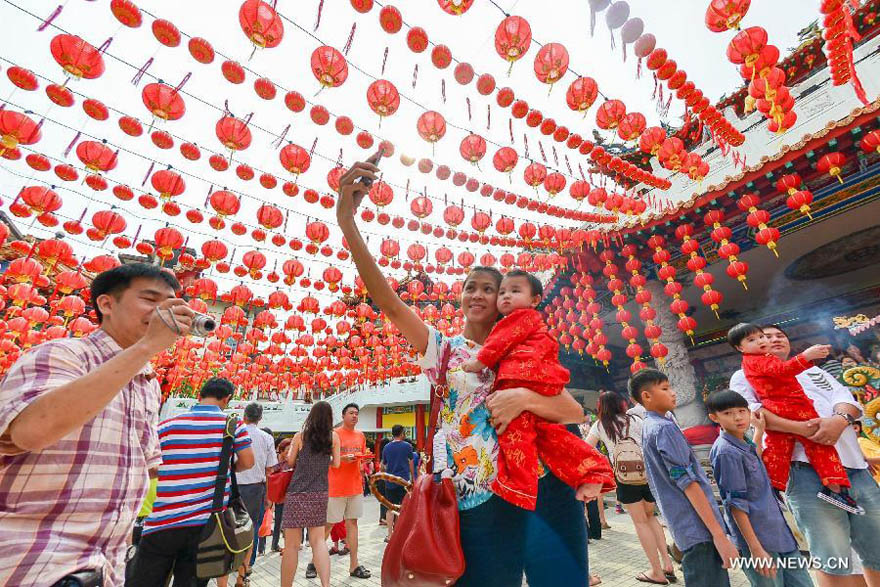 People take pictures at a temple to celebrate the Chinese Lunar New Year in Kuala Lumpur, Malaysia, Feb. 2, 2014. [Xinhua/Chong Voon Chung]