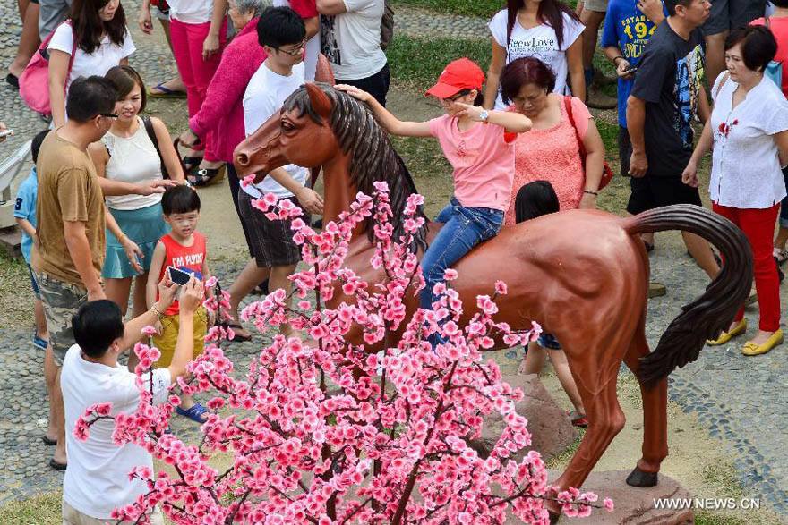 People take pictures at a temple to celebrate the Chinese Lunar New Year in Kuala Lumpur, Malaysia, Feb. 2, 2014. [Xinhua/Chong Voon Chung]
