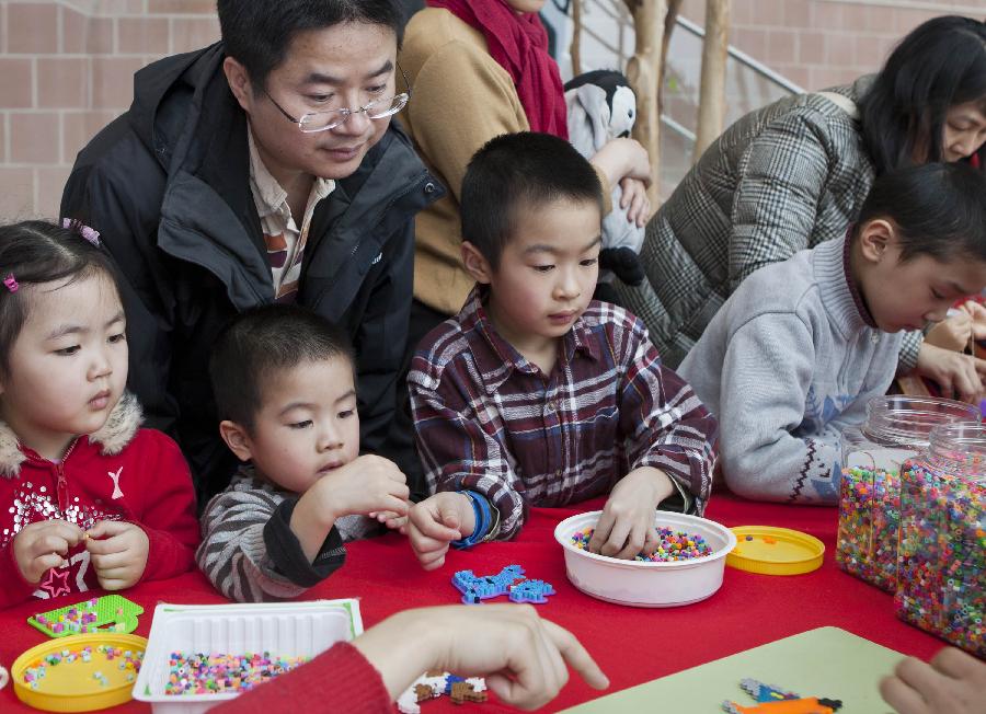 Kids make handicrafts during the 2014 Chinese New Year celebration at Markham Civic Centre in Markham, Greater Toronto Area, Canada, Feb. 1, 2014. [Xinhua/Zou Zheng]