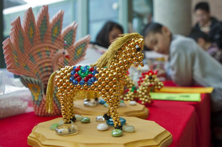 Kids watch handicraft works on display during the 2014 Chinese New Year celebration at Markham Civic Centre in Markham, Greater Toronto Area, Canada, Feb. 1, 2014. [Xinhua/Zou Zheng]