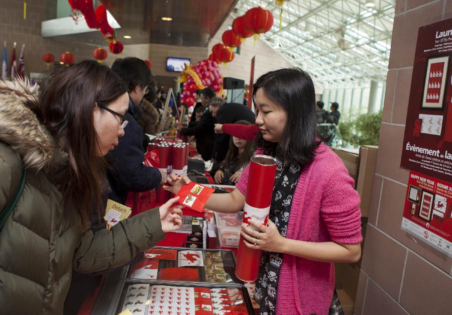 Collectors line up for purchasing the Year of the Horse stamps and collectibles during the 2014 Chinese New Year celebration at Markham Civic Centre in Markham, Greater Toronto Area, Canada, Feb. 1, 2014. [Xinhua/Zou Zheng]