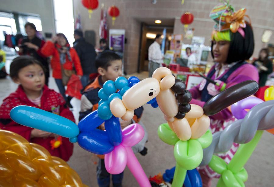 A balloon artist (R) makes the balloon twisting for kids during the 2014 Chinese New Year celebration at Markham Civic Centre in Markham, Greater Toronto Area, Canada, Feb. 1, 2014. [Xinhua/Zou Zheng]