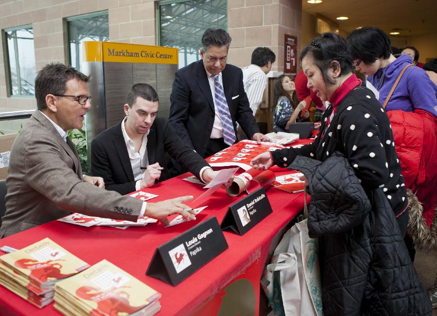 Louis Gagnon (L) and Daniel Robitaille (2nd L), designers of the Year of the Horse stamp, sign for collectors during the 2014 Chinese New Year celebration at Markham Civic Centre in Markham, Greater Toronto Area, Canada, Feb. 1, 2014. [Xinhua/Zou Zheng]