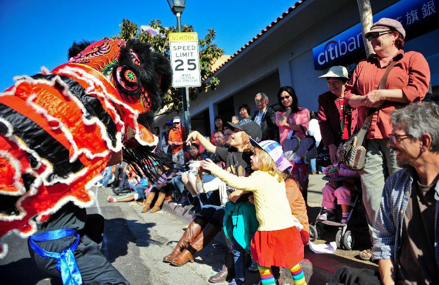 Actors who perform lion dance interact with local children in the Golden Dragon Parade in Los Angeles, the United States, Feb. 1, 2014. The 115th Golden Dragon Parade was held here on Saturday to celebrate Chinese Lunar New Year. [Xinhua/Zhang Chaoqun]