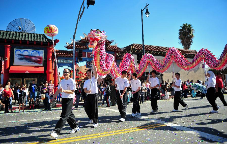Actors perform dragon dance in the Golden Dragon Parade in Los Angeles, the United States, Feb. 1, 2014. The 115th Golden Dragon Parade was held here on Saturday to celebrate Chinese Lunar New Year. [Xinhua/Zhang Chaoqun]