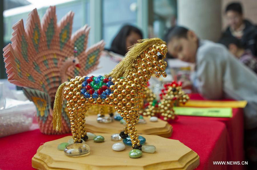 Kids watch handicraft works on display during the 2014 Chinese New Year celebration at Markham Civic Centre in Markham, Greater Toronto Area, Canada, Feb. 1, 2014. [Xinhua/Zou Zheng]
