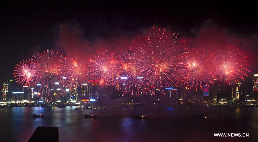 Fireworks light up the sky near the Victoria Harbour in south China's Hong Kong to celebrate the Spring Festival, Feb. 1, 2014. [Xinhua/Lui Siu Wai]