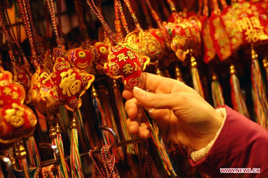 A woman checks out merchandise on display during the Chinese Lunar New Year celebrations at International Village Mall in Vancouver, Canada, on Jan. 31, 2014. Thousands of Canadians took part in today's Chinese New Year celebrations. [Xinhua/Sergei Bachlakov]