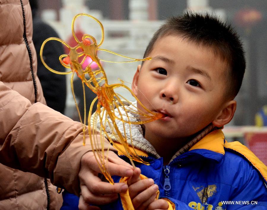 A boy eats a sugar figurine at a temple fair celebrating the Lunar New Year, known as the Spring Festival, in Zhengzhou, capital of Central China's Henan province, Jan. 31, 2014. The Lunar New Year begins on Jan. 31 and marks the start of the Year of the Horse, according to the Chinese zodiac. [Xinhua/Li An]