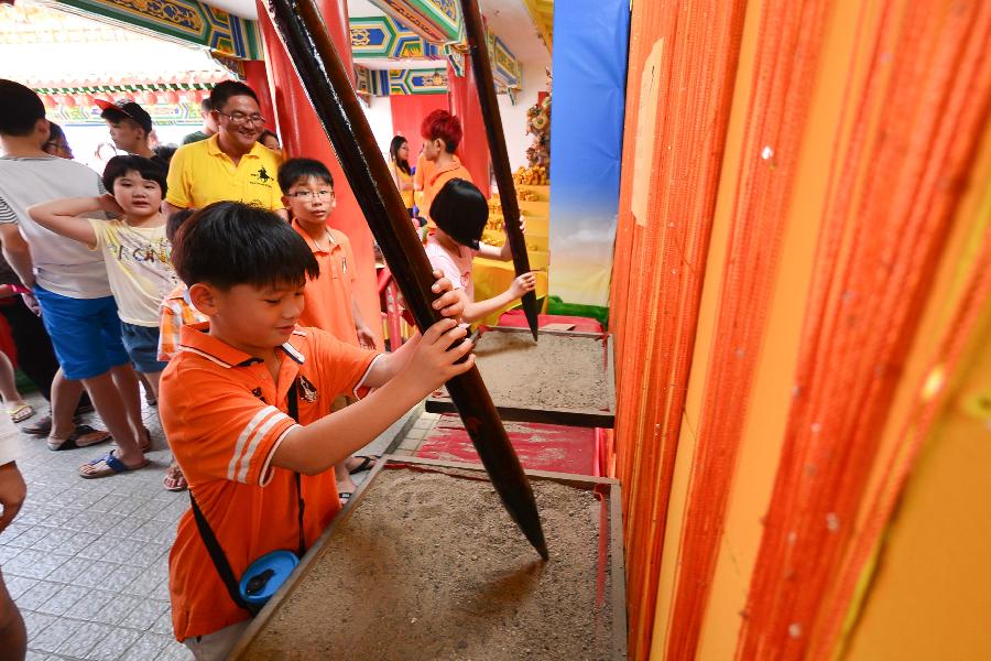 A kid writes at a temple to celebrate the Chinese Lunar New Year in Kuala Lumpur, Malaysia, Feb. 2, 2014. [Xinhua/Chong Voon Chung