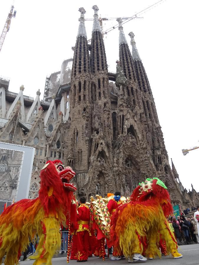 Actors perform lion dance to celebrate the Chinese Lunar New Year in front of the Sagrada Familia in Barcelona, Spain, Feb. 1, 2014. [Xinhua/Zhou Zhe]