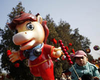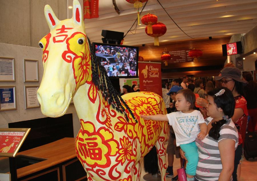 A child touches a horse-shaped doll during an event celebrating Chinese Lunar New Year in Wellington, New Zealand, Feb. 2, 2014. [Xinhua/Huang Xingwei]