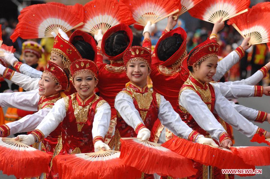 Girls perform during a Lunar New Year of the Horse Parade and celebration in Chinatown in Vancouver, Canada, Feb.2, 2014. The grand parade is one of the largest in North America, drawing more than 80,000 people to the streets of Chinatown. (Xinhua/Sergei Bachlakov)