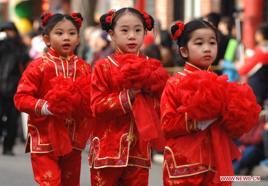 Girls take part in a Lunar New Year of the Horse Parade and celebration in Chinatown in Vancouver, Canada, Feb.2, 2014. The grand parade is one of the largest in North America, drawing more than 80,000 people to the streets of Chinatown. (Xinhua/Sergei Bachlakov)