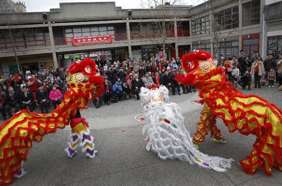 Audience enjoy a lion dance performance during the Chinatown Spring Festival in Vancouver, Canada, Feb. 1, 2014. Residents from different cultures participated in the Chinatown Spring Festival on Saturday to enjoy the atmosphere and joy that Chinese lunar new year brings. [Xinhua/Liang Sen]