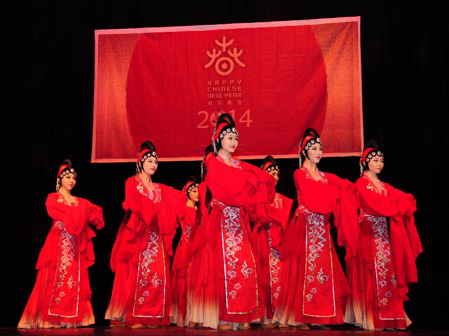 Zhengzhou Song and Dance Troupe perform Chinese dancing, music and martial arts on Feb. 3, 2014 as part of Chinese New Year celebrations. [Photo/ Xinhua]