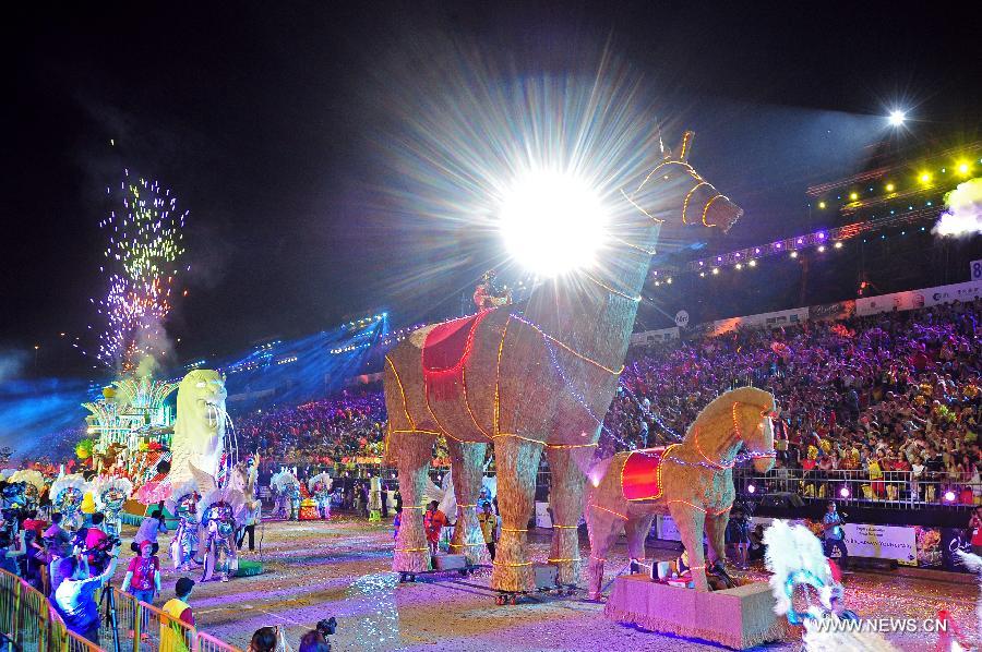 A horse-shape float parades during the Chingay Parade at the Singapore's F1 Pit Building in Marina Bay, Feb. 7, 2014. Singapore on Friday held the first day of the Chingay Parade to celebrate the Spring Festival. (Xinhua/Then Chih Wey)