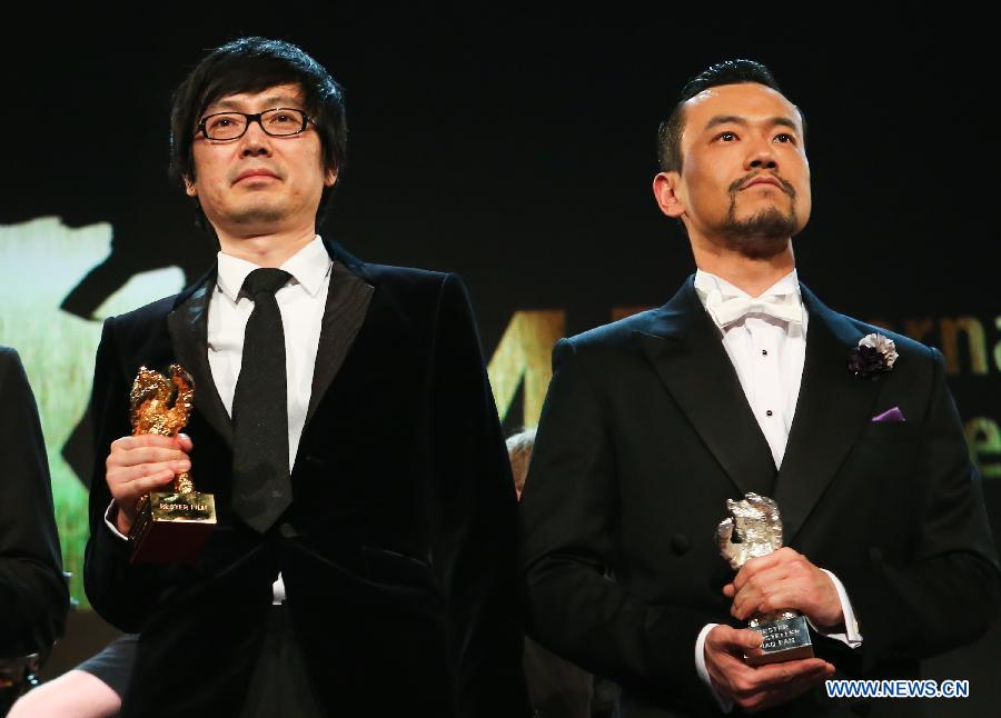 Director Diao Yinan (L) of "Black Coal, Thin Ice" , winner of the Golden Bear for the Best Film, and Liao Fan, winner of the Silver Bear for Best Actor for "Black Coal, Thin Ice", pose for photos during the awards ceremony at the 64th Berlinale International Film Festival in Berlin, Feb. 15, 2014. (Xinhua/Zhang Fan)