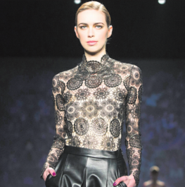 A model presents a creation from the Vivienne Tam 2014 Fall/Winter collection during New York Fashion Week.