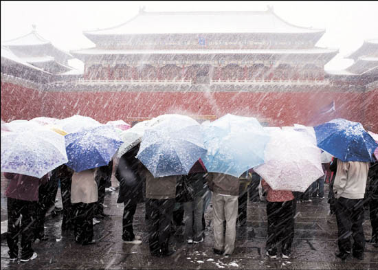 Visitors wait in snow to enter the Palace Museum in Beijing. As people are getting more interested in sharing information via social networks, scores of museums in China, including the Palace Museum, are making efforts to use technology to provide richer visits for guests, such as introducing iPad application and offering quick response code that details the exhibit’s history when scanned by smartphones. [Xinhua]