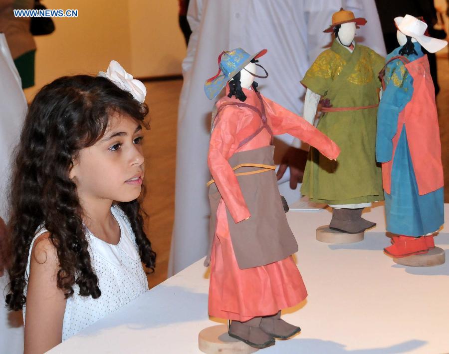 A girl visits a Chinese silk exhibition during the Chinese Cultural Week in Manama, Bahrain, April 10, 2014. The Chinese Cultural Week opened on April 10 to mark the 25th anniversary of the establishment of the China-Bahrain diplomatic ties. [Xinhua/Wang Bo]