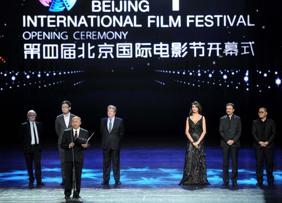 John Woo (front), director of the jury of the Tiantan Award, speaks during the opening ceremony of the 4th Beijing International Film Festival in Beijing, capital of China, April 16, 2014. The 8-day-long festival kicked off on Wednesday. [Xinhua/Luo Xiaoguang]