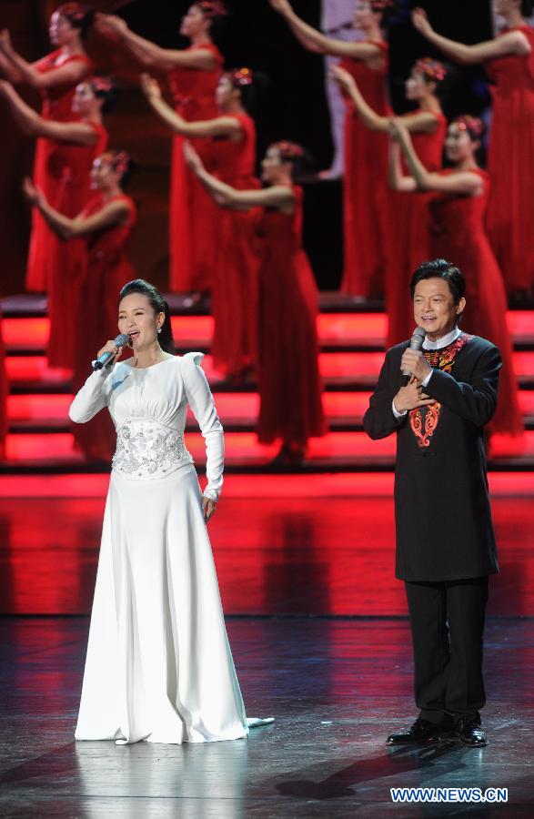Singer Lei Jia (L) and Mo Hualun perform during the opening ceremony of the 4th Beijing International Film Festival in Beijing, capital of China, April 16, 2014. The 8-day-long festival kicked off on Wednesday. [Xinhua/Luo Xiaoguang]