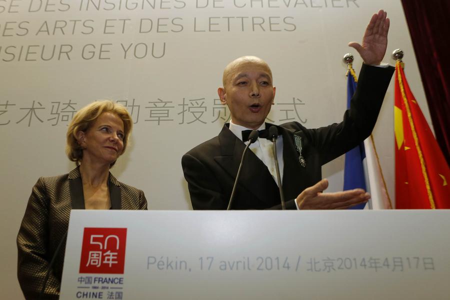 Chinese actor Ge You (R) speaks after receiving the Chevalier medal in the Order of Arts and Letters from Frederique Bredin, President of French National Center of Cinematography and the moving image, in Beijing, capital of China, April 17, 2014. [Xinhua/Zhang Yuwei]