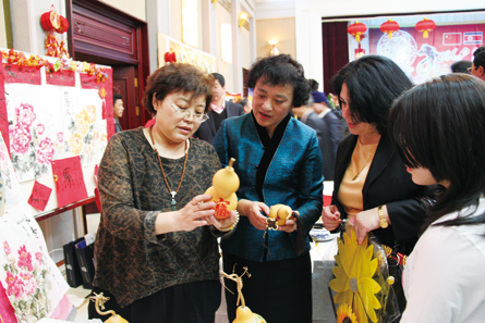 The wife of Chinese Ambassador to DPRK showed the diplomats the traditional Chinese gourd-carving handicrafts at the Chinese New Year Fair in Pyongyang, January,2014.