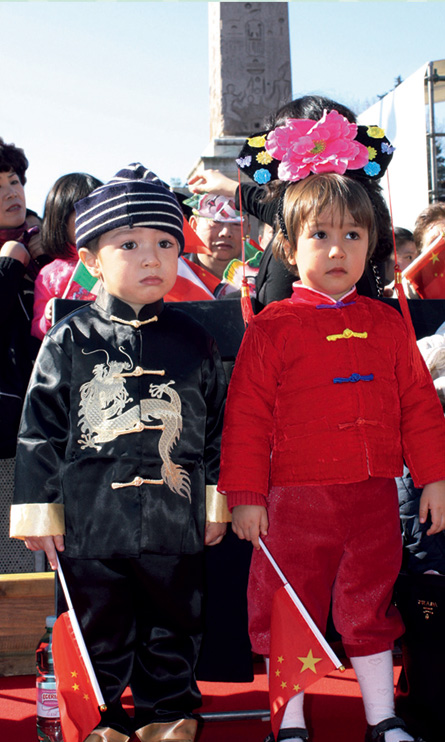 Italian Children in Chinese Traditional Coustumes Enjoying the Chinese New Year.
