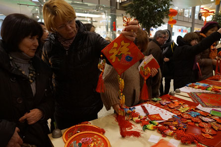 Visitors attracted by Chinese New Year ornaments displayed at the booth of China Cultural Center in Berlin.